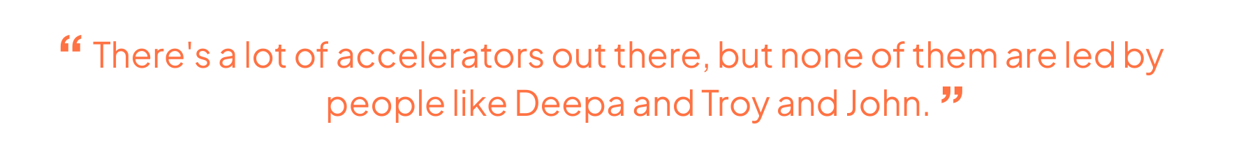 There's a lot of accelerators out there, but none of them are led by people like Deepa and Troy and John. None of them, particularly in this climate, are brave enough to say, we want to do this with people who don't look like most of the folks in Silicon Valley, and we're going to lean into it, even when everything else in the ecosystem is telling us not to bet on these folks.